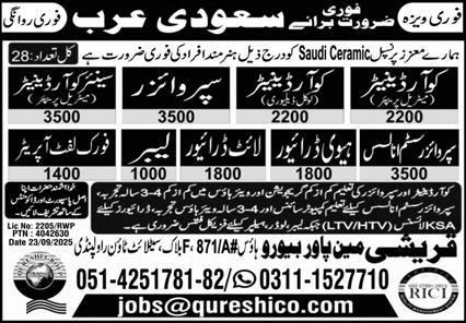 Qureshi Manpower Bureau invites applications for job positions advertised in daily Express dated 26 September 2025 for following vacancies in Riyadh, dammam Saudi Arabia.