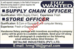 Supply Chain Officers and Store Officers are required inMetaline Industries Pvt Limited in Lahore. Send your application / CV Along with All necessary documents.