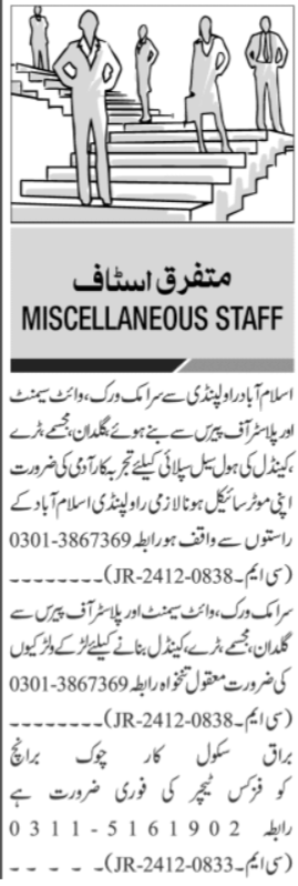 Vacant posts including physics teacher, karegar and supply staff are announced in Private Company Islamabad, islamabad and rawalpindi Islamabad Pakistan as per 27 December 2024 advertisement in daily Jang Newspaper. Intermediate, Matric, Middle, Master and Bachelor etc. educational qualification will be preferred.
