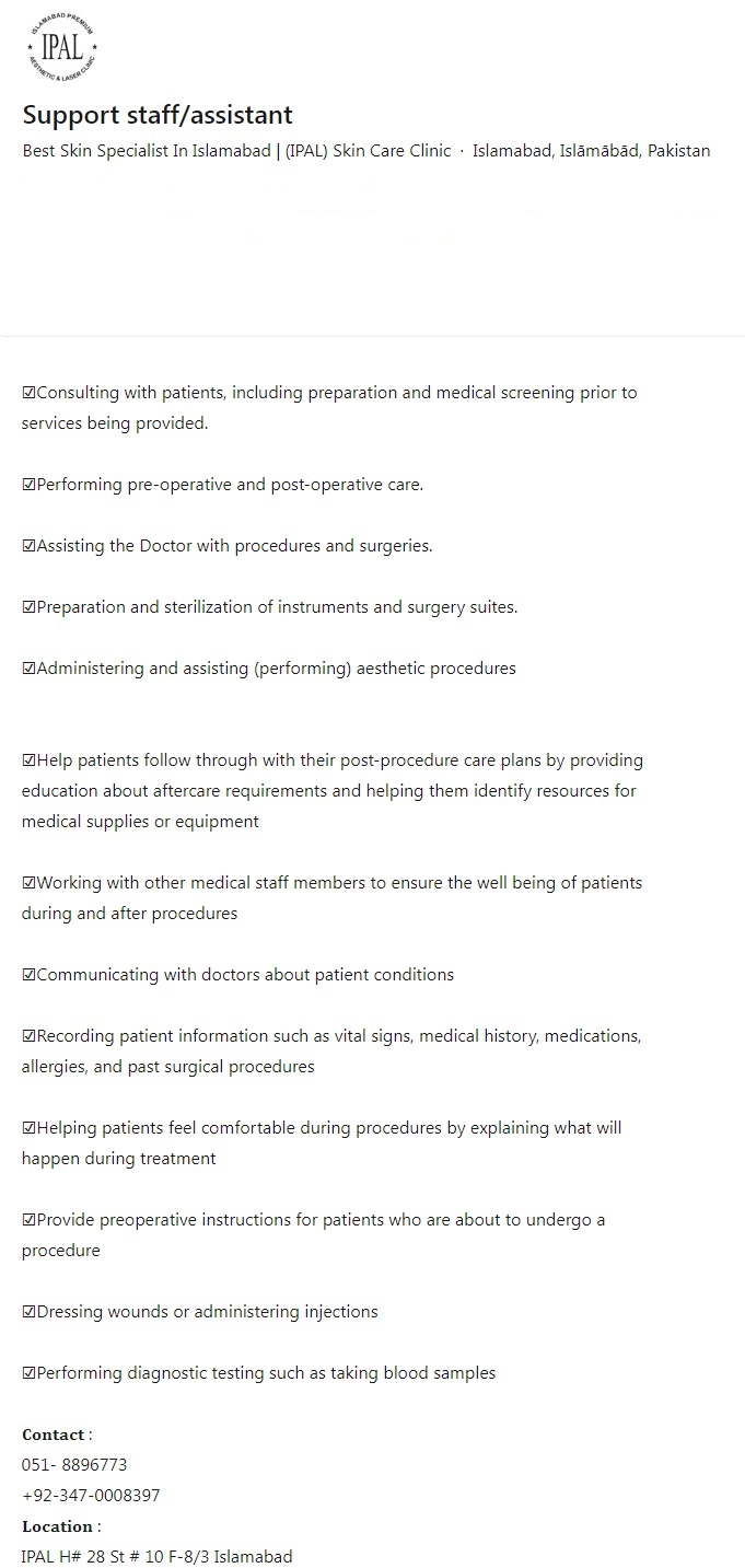 Original Source: https://pk.linkedin.com/jobs/view/support-staff-assistant-at-best-skin-specialist-in-islamabad-ipal-skin-care-clinic-3415642984?refId=4Y7oF%2Bp721DAOGfzXxX4RQ%3D%3D&trackingId=uBaUnInxE7uqOMDgEjsOMA%3