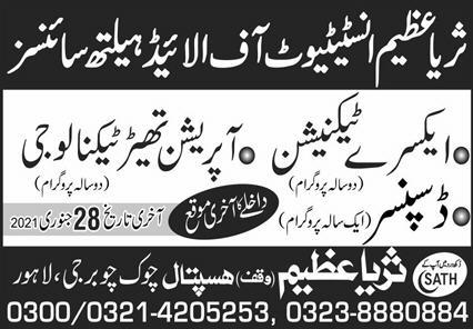 Surayya Azeem Institute of Allied Health Sciences has announced admissions for paramedical diploma in X-Ray Technician, Operation Theater Technology and Dispenser in Lahore. Read newspaper ad for exact details.