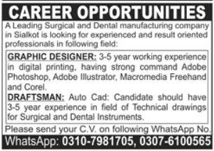 Surgical Company invites applications for job positions advertised in daily Jang dated 20 March 2022 for following vacancies in Sialkot, sialkot Punjab Pakistan.