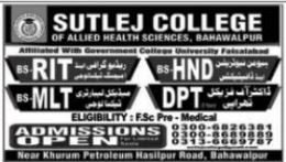 Sutlej College of Allied Health Sciences affiliated with Government College University Faisalabad is offering admissions in BS RIT, BS HND, BS MLT, DPT degree programs. Read newspaper ad for exact details.