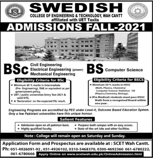 Swedish College of Engineering and Technology Wah Cantt affiliated with University of Engineering & Technology UET Taxila invites applications for admissions in BSc & BS Programs 2021. Read newspaper ad for exact details.