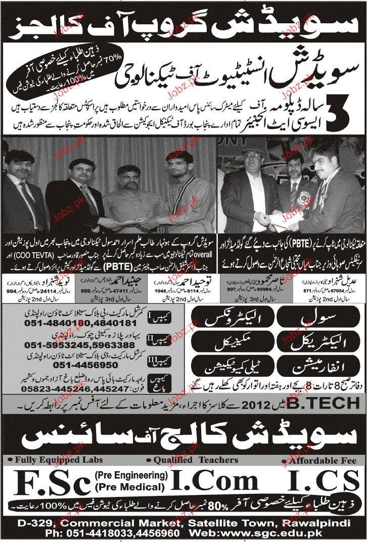 Sweedish College of Science Admission in Fsc, I.Com and ICs in Rawalpindi Read newspaper ad for exact details.