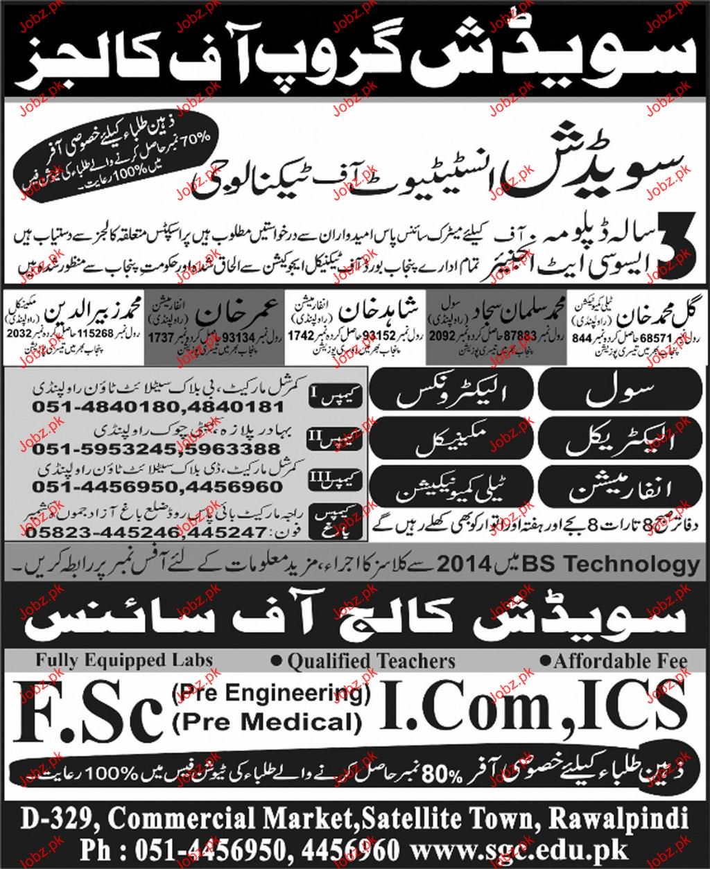 sweedish Group of Colleges Admission in DAE in Rawalpindi. Read newspaper ad for exact details.