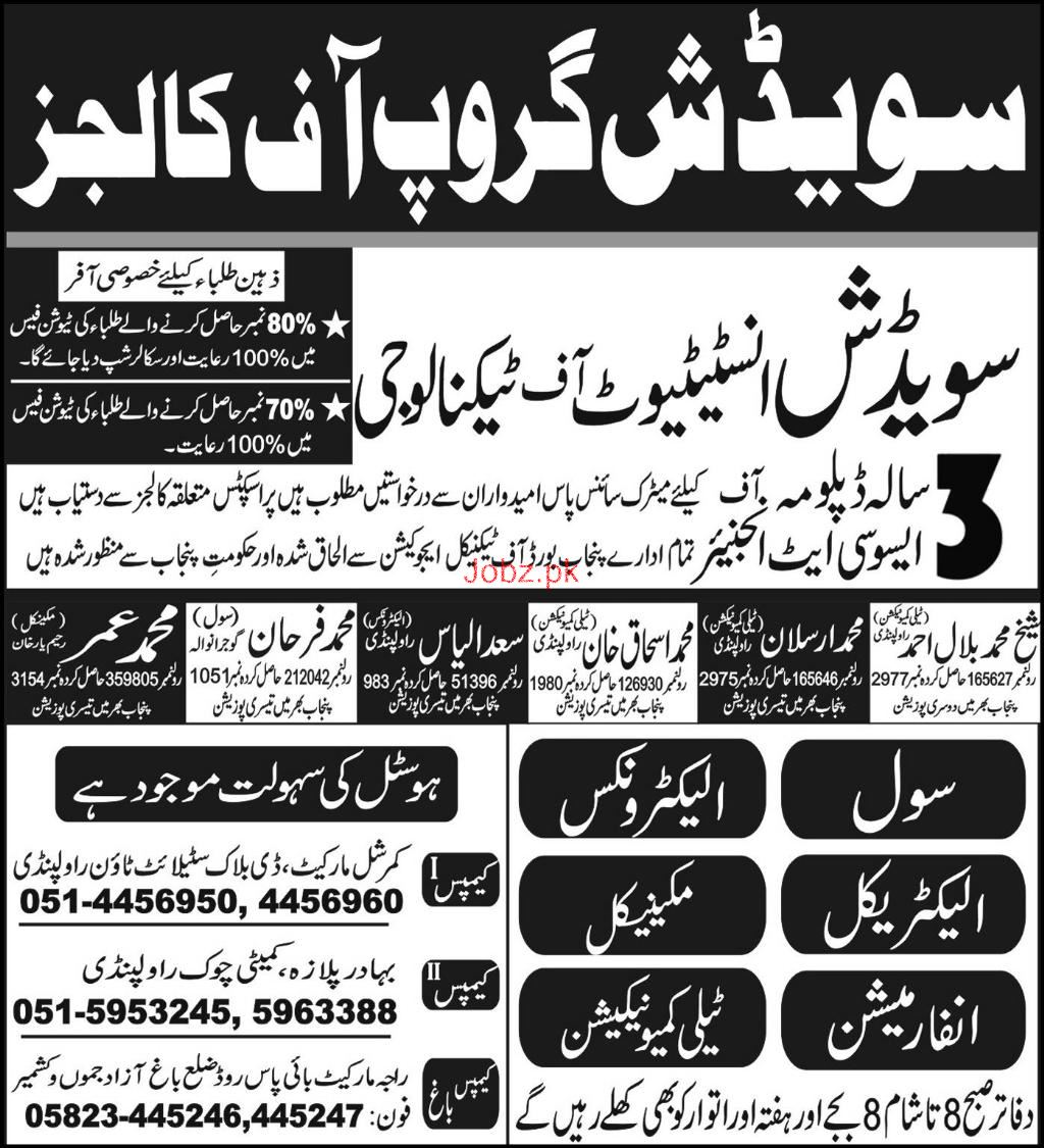 Sweedish Group of Colleges Admission in Diploma of Associate Engineer DAE in Ciivl Technology, Electrical Technology, Electronics Technology, Mechanical Technology in Rawalpindi. Read newspaper ad for exact details.