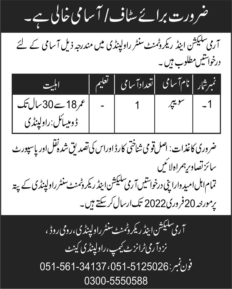 Army Selection & Recruitment Centre is looking for candidates for following posts as per job advertisement published in daily Nawaiwaqt Newspaper of February 4, 2022 for location Rawalpindi Punjab Pakistan: