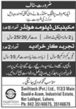Swifttech Pvt Ltd jobs advertisement dated about 15 May 2022 in daily Jang Newspaper invites application for the vacant post of mechanical engineer and lathe machine operator in Lahore, lahore Punjab Pakistan. DAE, Matric and Middle etc. educational qualification will be preferred.