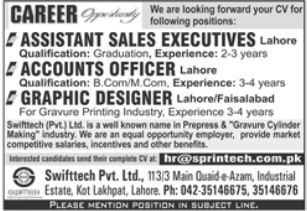 Swifttech Pvt Ltd Lahore Punjab Pakistan invites applications from eligible candidates for the post of Assistant Sales Executive as per advertisement of January 9, 2022 published in daily Jang Newspaper. B.com, Bachelor and M.com etc. educational qualification will be preferred.