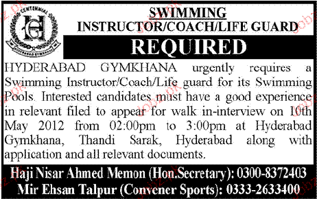Swimming Instructor / Coach / Life Guards Job Opportunity