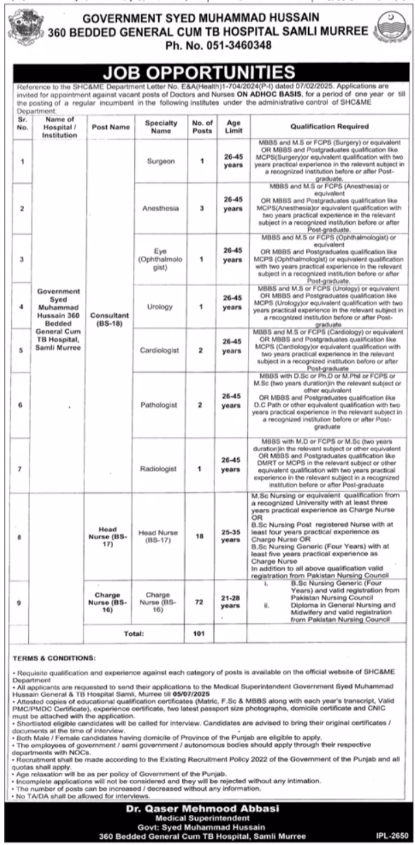 Vacant posts including anesthesia consultant, pathologist, surgeon consultant, head nurse, consultant ophthalmologist, eye consultant, medical consultant, charge nurse, cardiologist, urology consultant and radiologist are announced in Syed Muhammad Hussain Government TB Sanatorium Kashmir Road Murree, murree Punjab Pakistan as per 16 June 2025 advertisement in daily Dunya Newspaper. Candidates with MS, M.sc, MBBS and Others etc. educational background will be preferred.