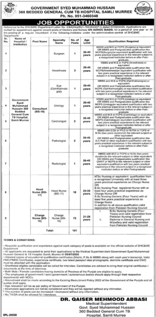 Latest Syed Muhammad Hussain Government TB Sanatorium Medical Posts Murree 2025