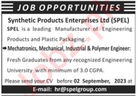 Vacant posts including mechanical engineer, mechatonics engineer, industrial engineer and polymer engineer are announced in Synthetic Products Enterprises Limited Lahore, lahore Punjab Pakistan as per 27 August 2023 advertisement in daily Jang Newspaper. Persons with B.E, Bachelor and DAE etc. education can apply.
