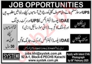 Systek Pvt Limited is looking for candidates for following posts as per job advertisement published in daily Jang Newspaper of January 26, 2025 for location Karachi, karachi Sindh Pakistan: