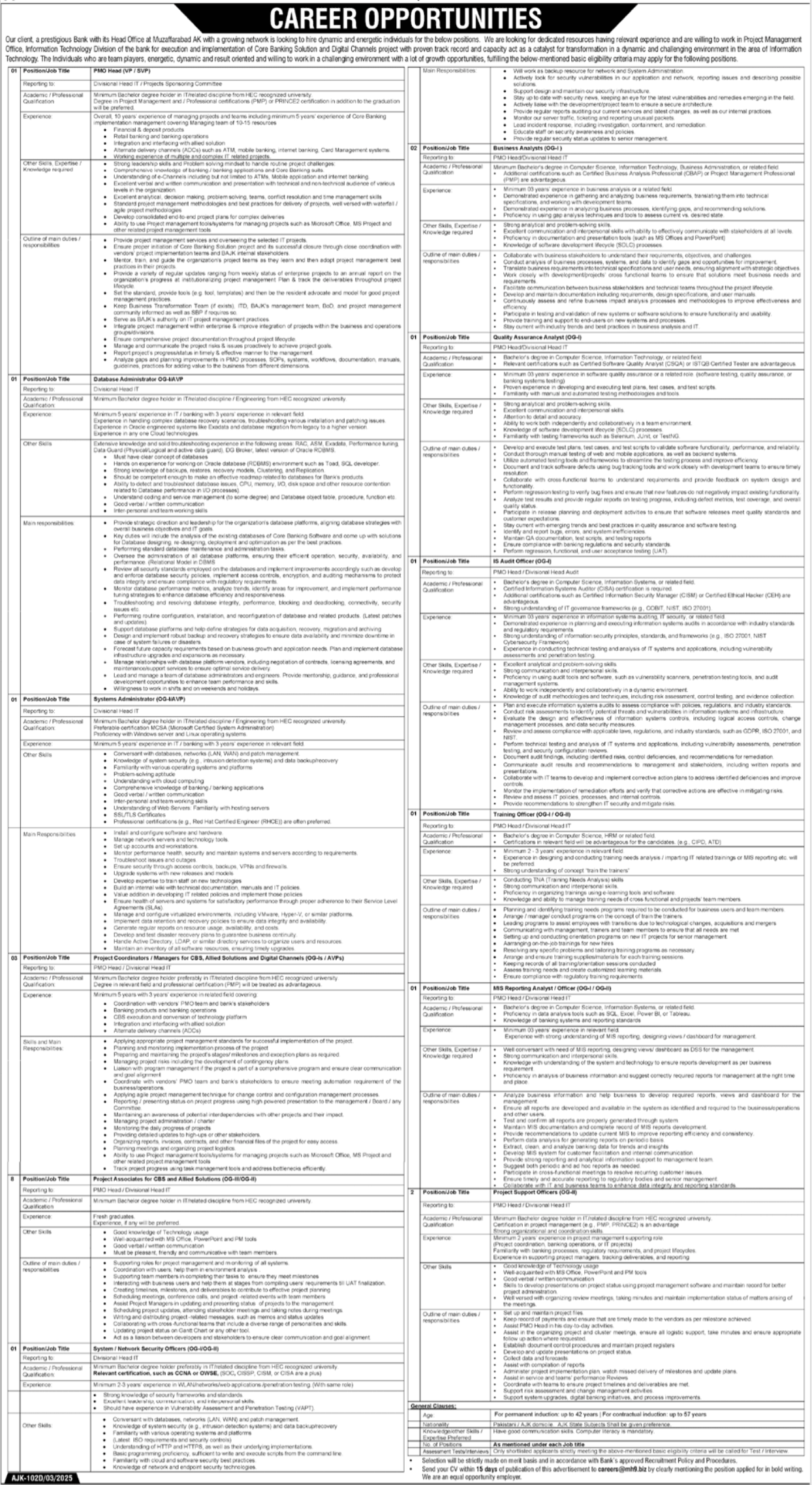 Vacant posts including training officer, project associate, quality assurance analyst, network security officer, database administrator, mis reporting analyst, pmo head, business analyst, system officer, system administrator, project coordinator, is audit officer and project support officer are announced in Commercial Bank Muzaffarabad, muzaffarabad AJK Pakistan as per 05 July 2025 advertisement in daily Dawn Newspaper. Preferred Education is Master and Bachelor etc.