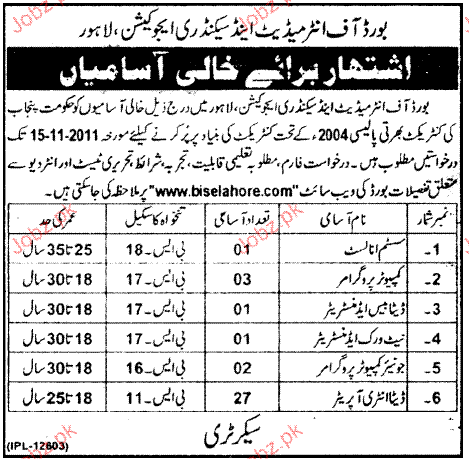 Latest Board of Intermediate and Secondary Education BISE Other Posts Lahore 2025