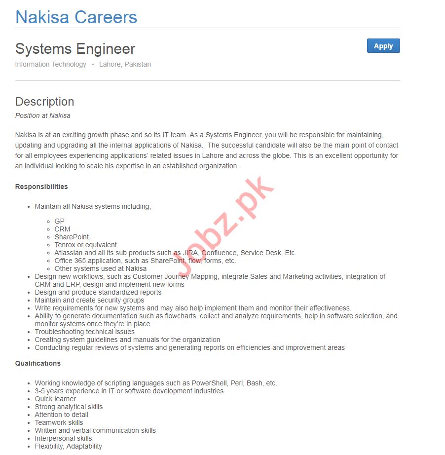 Systems Engineer Job 2019 In Lahore