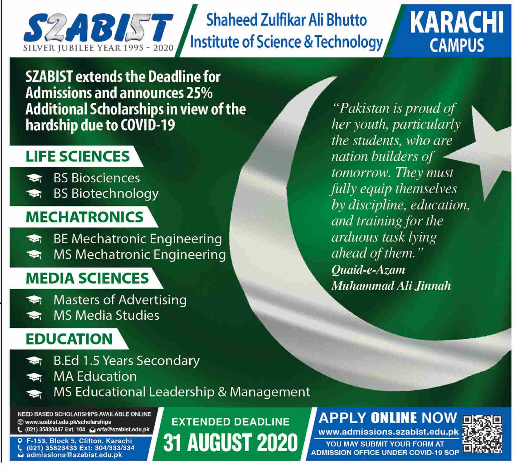 Shaheed Zulfiqar Ali Bhutto Institute of Science & Technology SZABIST has announced admissions in BS Bio Sciences, BS Biotechnology, BE Mechanical Engineering, MS Mechatronic Engineering, Masters of Advertising, MS Media Studies, B.Ed, MA Education and MS Educational Leadership & Management. Read newspaper ad for exact details.