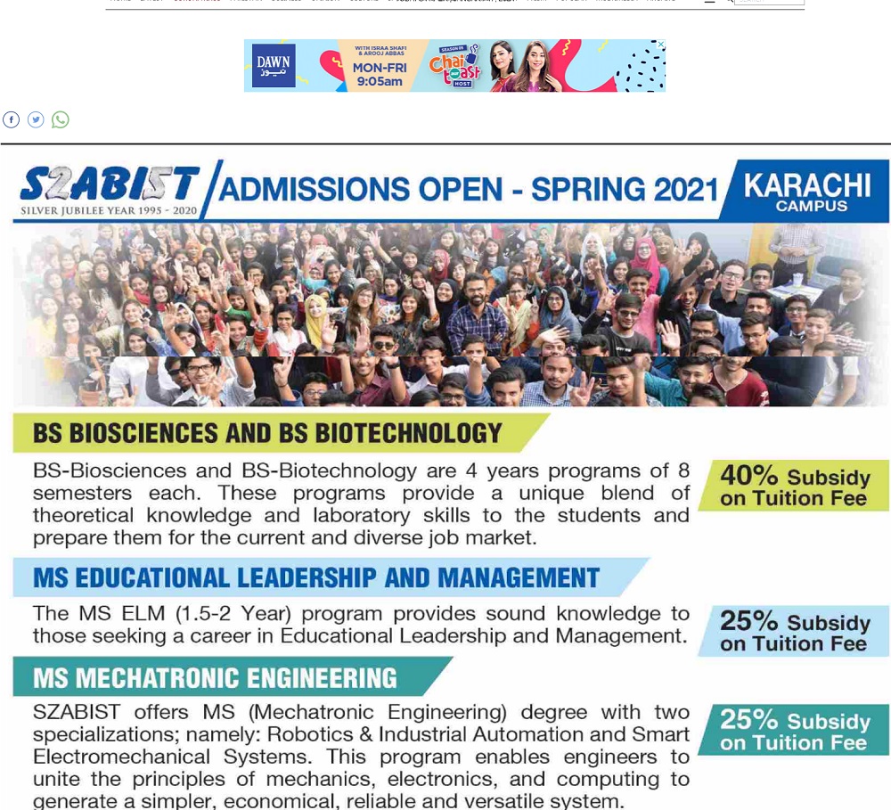 Shaheed Zulfikar Ali Bhutto Institute of Science and Technology SZABIST Karachi Campus has announced online admissions in BS Biosciences, BS Biotechnology, MS Mechatronic Engineering, MS Educational Leadership & Management. Read newspaper ad for exact details.