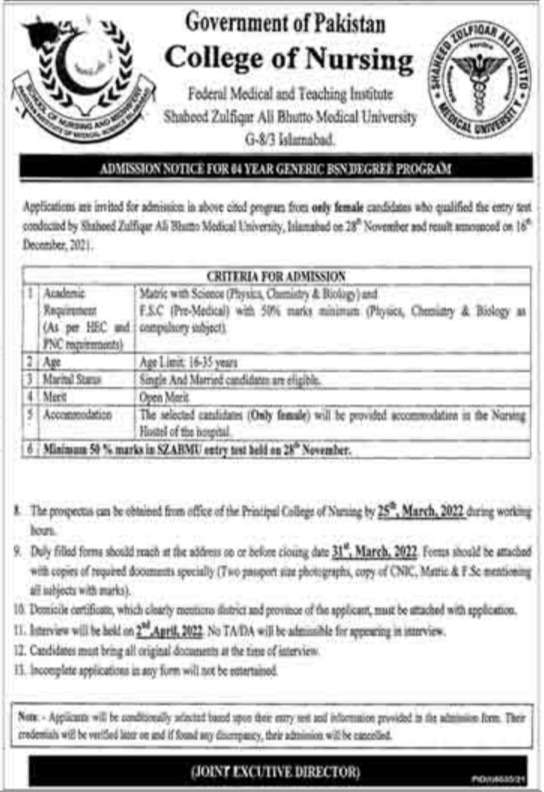 Shaheed Zulfiqar Ali Bhutto Medical University admissions 2022 for bsn, has been announced. Students who want to take admissions in Shaheed Zulfiqar Ali Bhutto Medical University Islamabad Islamabad Pakistan for academic year 2022 to continue education in Other University can apply. Eligible students for fulfilling criteria for admissions in BSN can enroll as per Government admission policy 2022 till closing date 31 March 2022. Read newspaper ad for exact details.