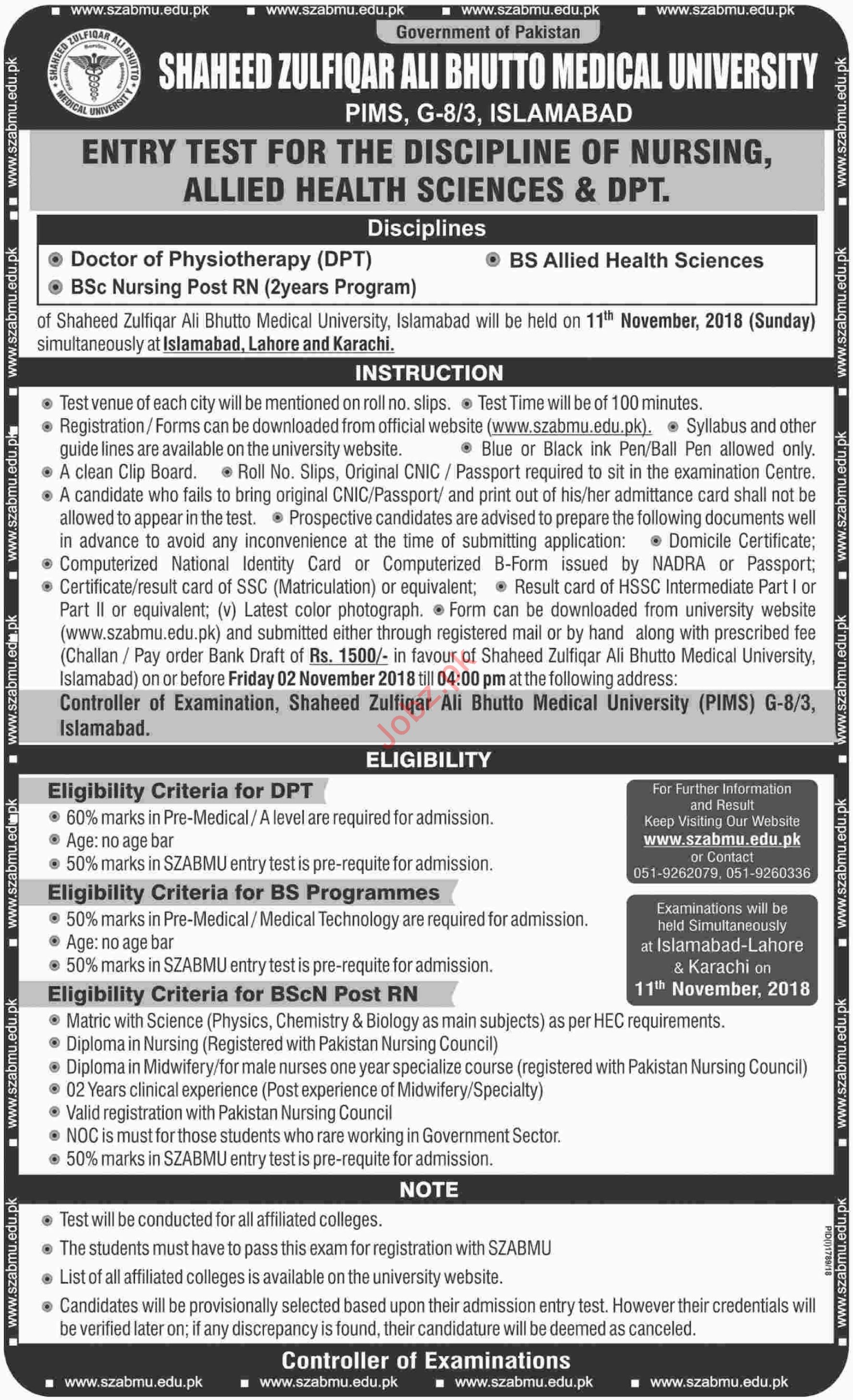 Shaheed Zulfiqar Ali Bhutto Medical University SZABMU Islamabad, Pakistan are opened admissions 2018 for the classes of DPT, BSc Nursing and BS Allied Health Sciences. Read newspaper ad for exact details.