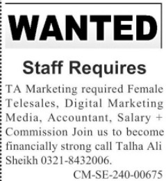 Vacant posts including accountant, telesales officer and digital marketing officer are announced in TA Marketing Lahore, lahore Punjab Pakistan as per 23 September 2024 advertisement in daily Jang Newspaper. Preferred Education is Master, Intermediate and Bachelor etc.
