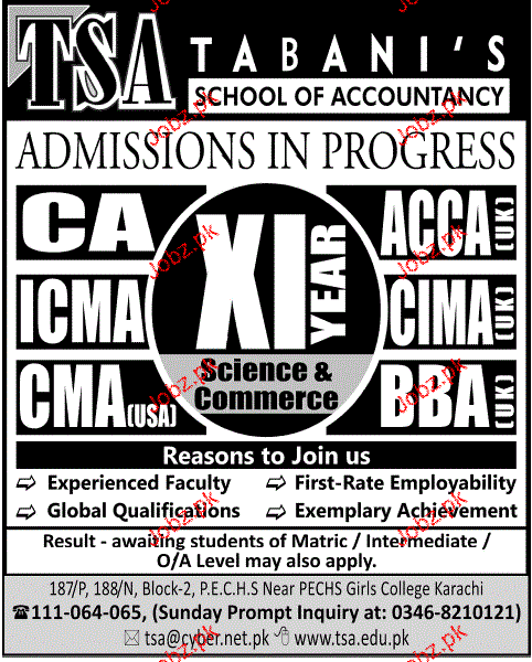 Tabani' School of Accountancy Admission in ACCA, CA, BBA, CMA and CIMA in Karachi. Read newspaper ad for exact details.