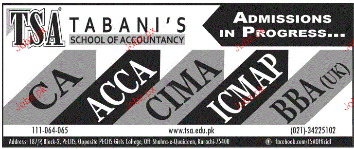 Tabani' School of Accountancy Admission in ACCA / CIMA in Karachi. Read newspaper ad for exact details.