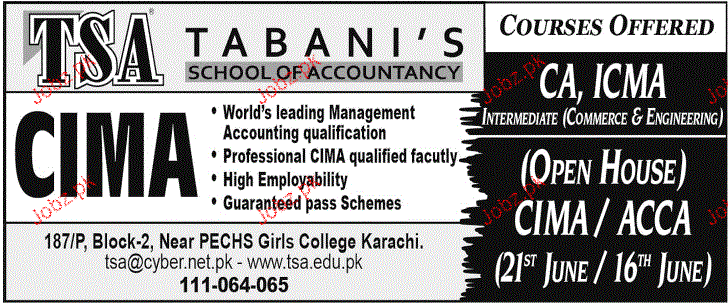 Tabani' School of Accountancy Admission in CIMA in Karachi. Read newspaper ad for exact details.