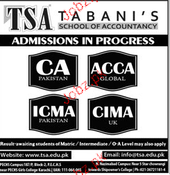 Tabanis School of Accountancy Admission in CA. ACCA, ICMA and CIMA in Karachi. Read newspaper ad for exact details.