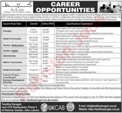 Tahaffuz Darsgah Lahore, lahore Punjab Pakistan invites applications from eligible candidates for the post of charity project coordinator, business development executive, head of curriculum, administrator, english teacher, student counselor, maths teacher, accountant, admin and principal as per advertisement of June 30, 2024 published in daily Jang Newspaper. Educational qualifications required MA, Bachelor, Master, B.ed and M.sc etc.