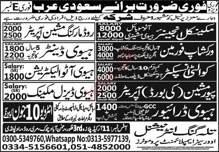 Vacant posts including Heavy Denter, Quality Inspector, Heavy Auto Electrician, Road Marking Machine Operator, Heavy Diesel Mechanic, Workshop Foreman, Heavy Driver, Mechanical Engineer, Driver, Paver Machine Operator and Htv Driver are announced in Talagang International Overseas Employement Promoters Riyadh, riyadh Saudi Arabia as per 10 June 2024 advertisement in daily Express Newspaper. Primary, Matric and Middle etc. educational qualification will be preferred.
