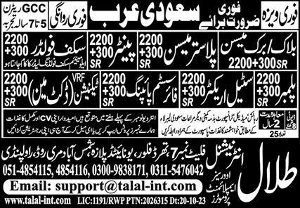 Talal International Overseas Employment Promoters Riyadh, riyadh Saudi Arabia invites applications from eligible candidates for the post of scaff folder, brick mason, fire system piping, painter, plaster mason, steel aractor, technician, plumber and block mason as per advertisement of October 25, 2023 published in daily Express Newspaper. Preferred Education is Matric, Intermediate, Primary and Middle etc.