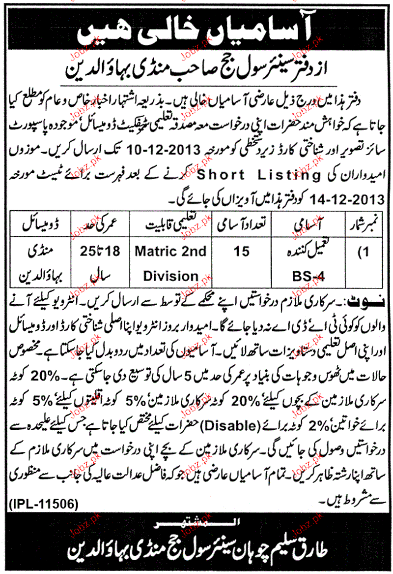 Latest Civil Judge Admin Clerical Posts Mandi Bahauddin 2025