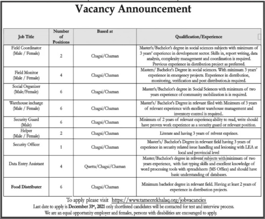 Tameer e Khalaq Foundation is urgently looking for professional qualified, experienced and highly motivated candidates for the vacant positions of Filed Coordinator, Filed Monitor, Warehouse Incharge, Security Guard, Security Officer, Data Entry Assistant, Food Distributor.