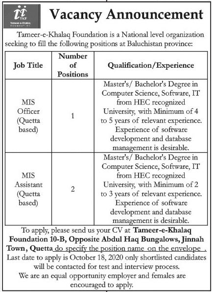 Vacancies in Tameer E Khalaq Foundation Advertisement October 2020