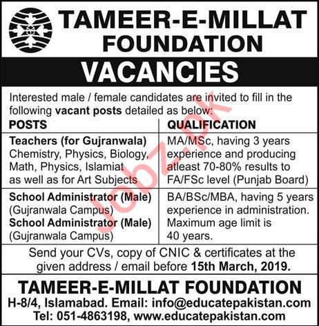 Latest Tameer e Millat foundation Teaching Posts Gujranwala 2025