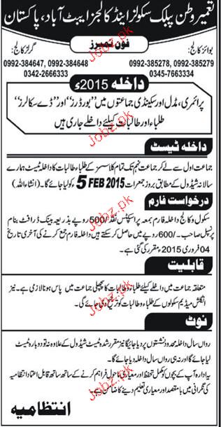 Tameer-e-Watan Public School and College Admission in Class Prep to IX in Abbottabad. Read newspaper ad for exact details.
