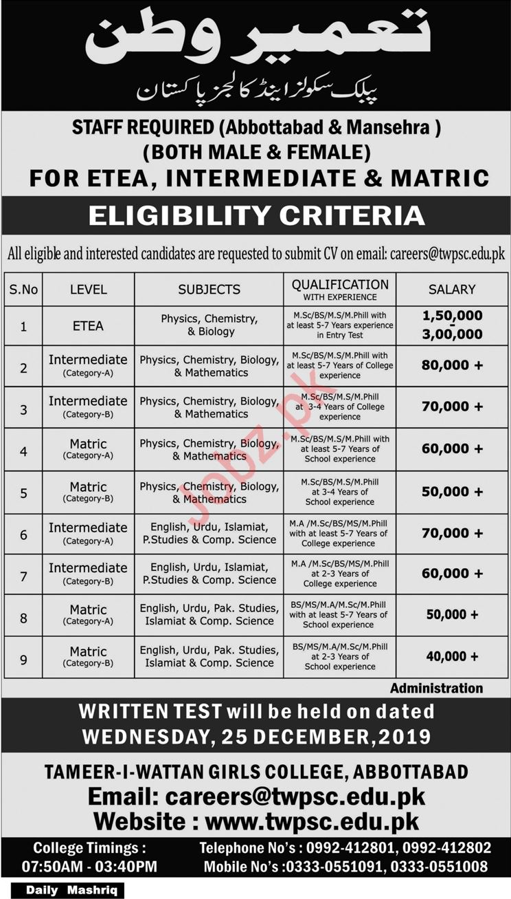 Vacancies in Tameer E Watan Public School & Colleges Advertisement December 2019