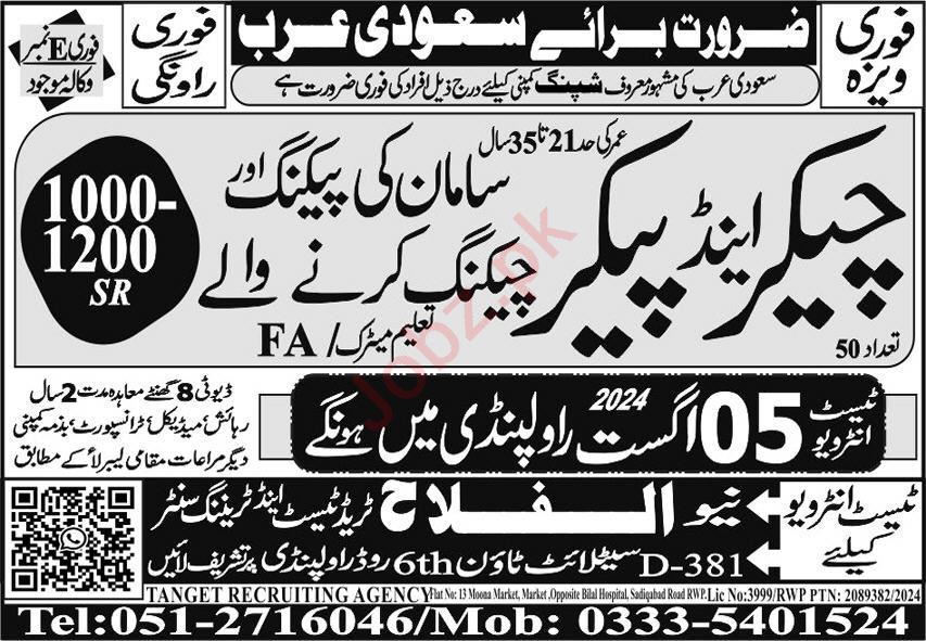 Tangent Recruiting Agency jobs advertisement dated about 5 August 2024 in daily Express Newspaper invites application for the vacant post of packer and checker in Riyadh, riyadh Saudi Arabia. Educational qualifications required Primary, Middle and Matric etc.