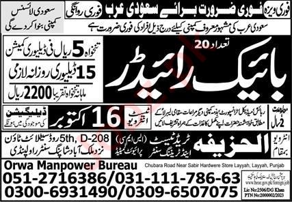 Vacant posts including bike rider are announced in Tangent Recruitment Agency Overseas Employment Promoters Riyadh, riyadh Saudi Arabia as per 15 October 2023 advertisement in daily Express Newspaper. Persons with Primary, Matric and Middle etc. education can apply.