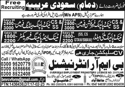BMR Arab Tech International is looking for candidates for following posts as per job advertisement published in daily Express Newspaper of February 18, 2023 for location Dammam, riyadh Saudi Arabia: