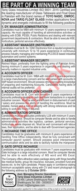 Tariq Glass Industries Limited invites applications from highly qualified and well educated candidates for the positions of Deputy Manager Administration, Assistant Manager Instrument, Assistant Manager Security, Accounts Officer, Cashier, Administration Officer, Incharge Time Office and Gate Office Incharge in Sheikhupura Punjab 2019.