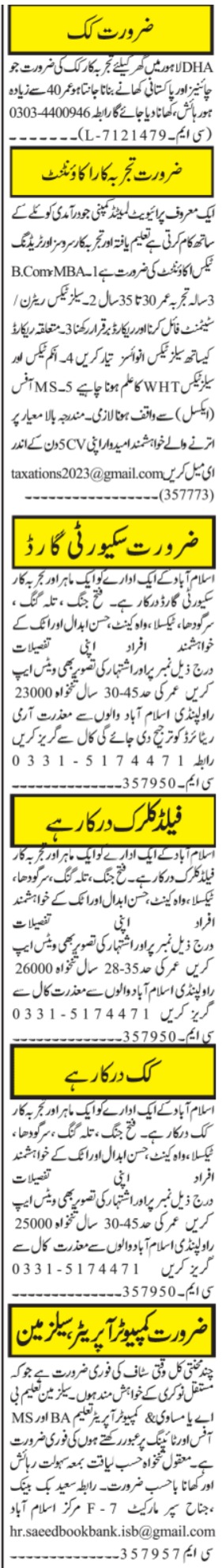 Vacant posts including accountant, clerk, tax accountant, field clerk, security guard, cook, chef, computer operator and salesman are announced in Private Company Islamabad, islamabad Islamabad Pakistan as per 19 August 2022 advertisement in daily Jang Newspaper. Preferred Education is Middle, Intermediate, Bachelor and Matric etc.