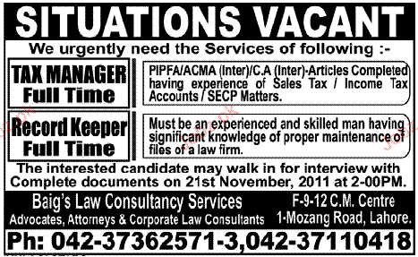 Tax Manager And Record Keeper Job Opportunity