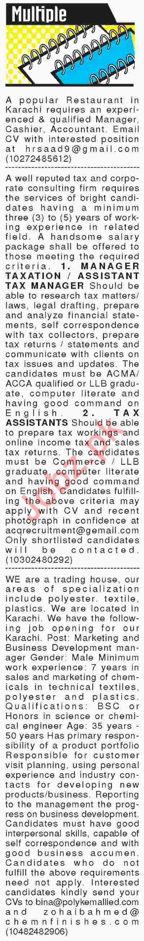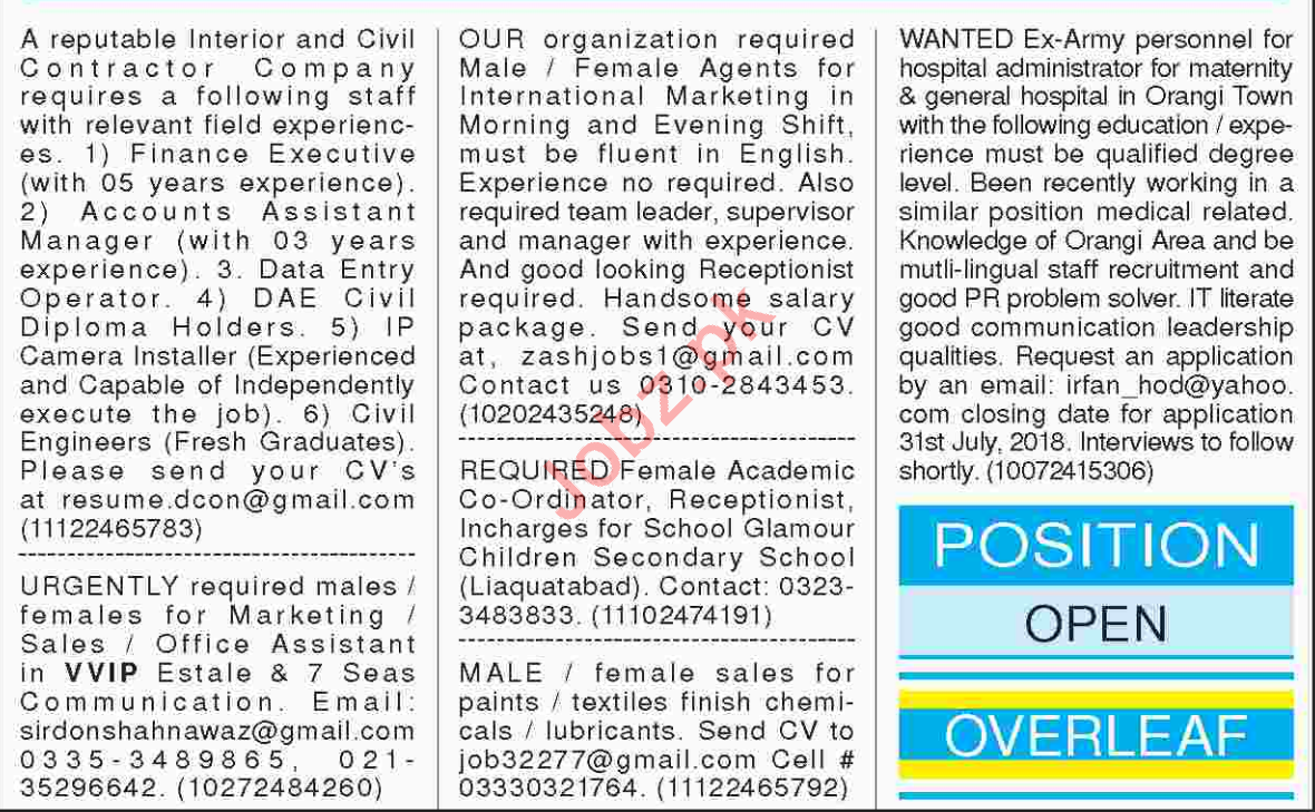 Consultants, Trainee Managers, Academic Coordinator, Production Manager, Engineering Consultant, Civil Engineer, Mechanical Engineer, Electrical Engineer, Electronics Engineer, , Ladies & Gents Quality Controller, Ladies Hepler, Incharge Supervisor, Stitching Reporter, Factory Accountant, Assistant Manager Production, Cutting Incharge, Machine Operators, Special Machine Operators, Flour Incharges, Quality Auditor and Receptionist required in well reputed companies.
