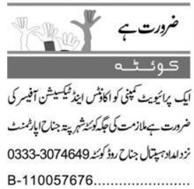 Vacant posts including taxation officer and accounts officer are announced in Private Company Quetta, quetta Balochistan Pakistan as per 9 July 2024 advertisement in daily Express Newspaper. Preferred Education is Bachelor, B.com and BBA etc.