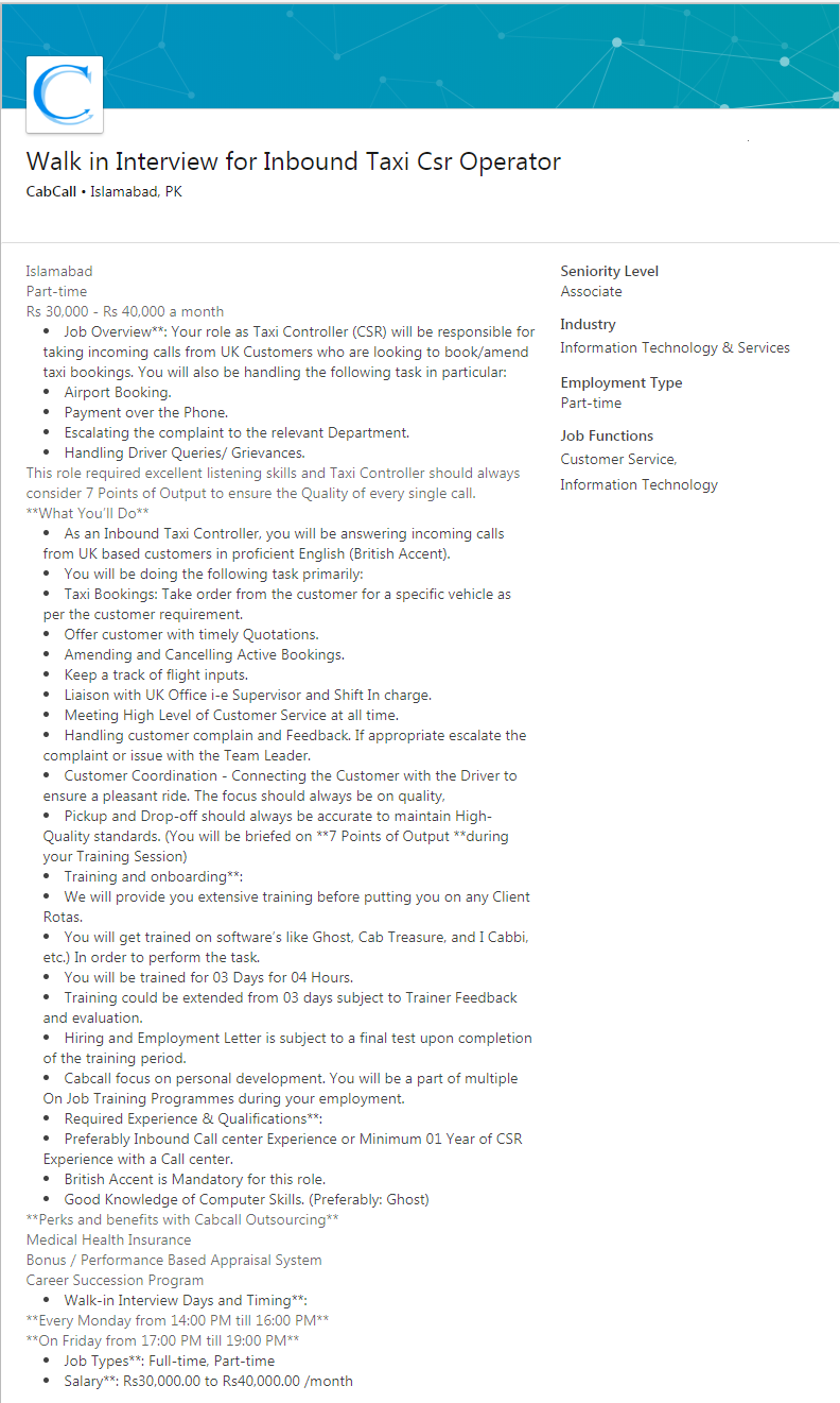 Latest CabCall International IT Posts Islamabad 2025