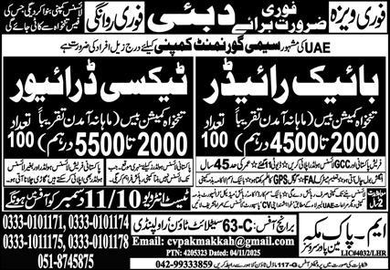 M Pak Makkah Manpower Services Dubai, abu dhabi Dubai invites applications from eligible candidates for the post of driver, taxi driver, bike rider and ltv driver as per advertisement of December 10, 2025 published in daily Express Newspaper. Educational qualifications required Intermediate and Matric etc.